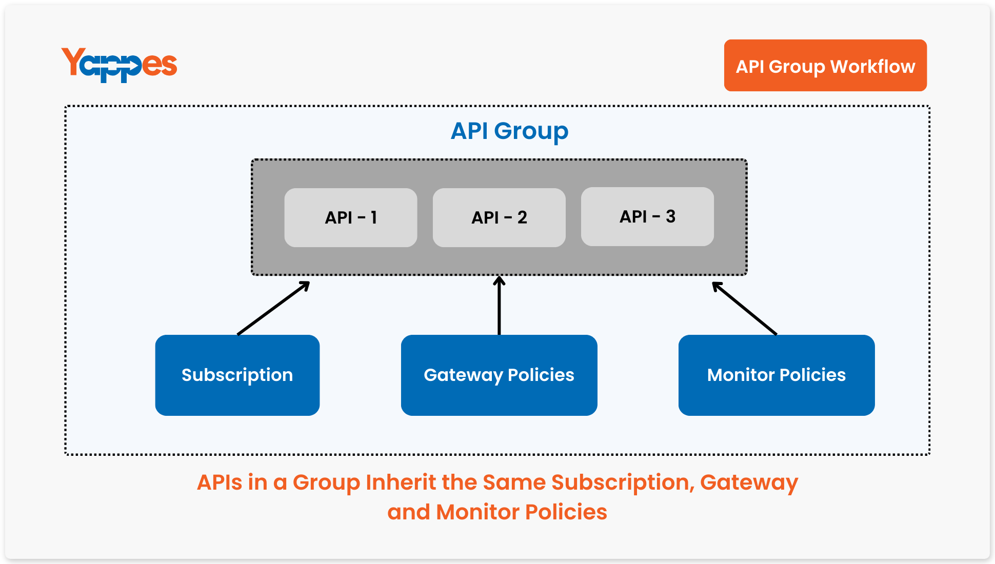 And to these groups you can apply a subscription that would be applied to all the APIs in that group. In addition, you can create and attach gateway and monitor policies to the group, and the APIs present in that group will inherit those policies.